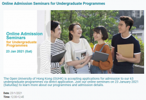 網上課程講座 香港公開大學將於2021年2月5日(星期五)下午4時舉行網上課程講座。 歡迎有興趣的人士可於2月3日前按此填寫網上表格登記參與。 課程內容及相關連結: 登記護士(普通科)訓練課程網頁 網上入學申請系統