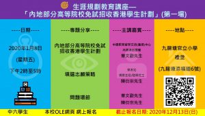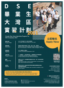 這是全港唯一專為DSE畢業生而設的內地實習計劃。自2015年暑假開始,本計劃先後帶領近800名應屆DSE畢業生到粵港澳大灣區多個大型企業進行工作體驗。參加者通過實習了解到不同公司的日常運作,獲取寶貴的工作經驗。此外,周末及假日豐富的交流及考察活動,也讓參加者全方位領略當地的生活與文化,交朋結友,增廣見聞。 實習日期:2021年5月尾至7月(5至6星期) 實習地點:粵港澳大灣區的內地城市(廣州、深圳、佛山、東莞等) 招募對象:2021年應屆中六畢業生 團費:港幣2500元正(包括集體來回實習城市交通、住宿、基本旅遊保險及交流活動) 參加者如經學校推薦或自薦計劃報名並獲取錄,上述活動費用可獲全數贊助 保證金:港幣2000元正,參加者依規定完整完成實習及團前團後活動後,保證金將獲全數退還 有用資料: 官方網站