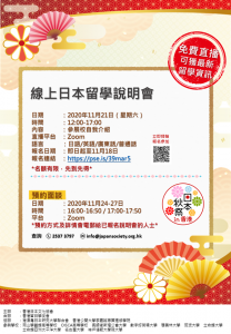 本月的11月21日(六),香港日本文化協會將舉辦「日本留學説明會及展覧會」的線上活動,此為一個「合同學校説明會」。在香港,已經有不少日語學校活躍於介紹有關日本留學的資訊,特別是日本語學校及專門學校的範疇,對於學生來說,資料已經非常充足。因此,香港日本文化協會的留學介紹主要集中在後期中等教育、學士課程、碩士課程的範疇上。 >>線上日本留學說明會報名連結<< 即使只是擁有初級的日語能力的學生,他們都可以報讀日本的相關課程,不一定必要達到N2程度,實際要求視乎課程而定。而有關後期中等教育、學士課程、碩士課程的概要可以參考香港日本文化協會於9月20日舉行的「日本留學説明會及展覧會」,以及「日本留學説明會」系列的部分。如有興趣了解更多資訊,歡迎前往香港日本文化的社交平台觀看影片。 (https://www.facebook.com/hkjapansociety/videos)