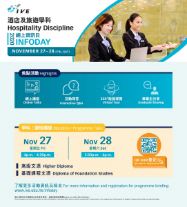 「2020網上資訊日」– IVE酒店及旅遊學科 職業訓練局(VTC)將於11月27日至28日一連兩日舉辦「2020網上資訊日」,由學科講師主持課程講座,讓您掌握酒店及旅遊學科高級文憑2021年度最新的入學資訊,您可以藉此機會於網上詢問升學問題,由學科講師即時解答。歡迎各學生、家長和老師登入以下超連結登記參加酒店及旅遊學科網上講座 ! https://www.ive.edu.hk/infoday