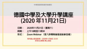 近年越來越多學生選擇前往外地升讀中學及大學。除了英、美、澳、加等熱門的國家外,家長和學生也開始前往其他國家升學。有見及此,香港輔導教師協會將與 DAAD 德國學術交流中心及 KICKEASY GmbH 港德項目交流合辦「德國中學及大學升學講座」。 日期: 2020年11月21日(星期六) 時間: 上午10時至11時半 形式: