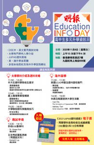為協助同學掌握全面及實用的選科資訊,《明報》「高中生多元升學資訊日2020」將於11月8日舉行,請來多位升學專家即場講解選科須知、技巧及策略,助考生報讀心儀學系。同場並設有本地及海外院校即場諮詢服務,讓你在12月9日的JUPAS首次選科申請截止前率先準備,助你籌劃未來! 日期: 2020年11月8日 (星期日) 時間: 上午10時30分至下午4時30分 地點: 香港康得思酒店7樓 (九龍旺角上海街555號) 網頁: