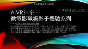 AIVR 是一間社會企業公司,提供創意工業的職涯規劃服務,透過以創作微電影、航拍、VR 製作等拍攝過程,藉此讓青年和學生了解自己的興趣和能力, 了解媒體製作工作崗位的職務要求,以及團隊合作精神的重要。 AIVR 舉辦名為「AIVR 社企–微電影職場影子體驗系列」(下稱「系列」),目的旨在讓學生在本公司職員的帶領下,親身體驗微電影製作過程,認識各項專業工作的細節,工作內容包括導演、劇本、化妝、攝影、燈光、場務、特別視藝效果、剪接及配樂等,藉此開闊學生的職場視野及知識,有助培養他們的待人處事的態度,增強他們的溝通能力及團隊精神,有助他們的生涯規劃。 是次計劃對象為年滿 15