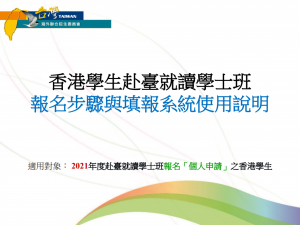 2021年聯招赴台升學「個人申請」 個人申請 (學士班) 線上填報:2020年11月1日~12月18日 紙本繳件:2020年12月5~18日 <地點:海華服務基金_香港九龍尖沙咀彌敦道101號海防大廈701-703室> 報名費:港幣500元 備審資料上傳及提交:2021年1月6日臺灣時間下午5時前須完成 報名流程說明: https://bit.ly/37qJ3ZM 香港學生來臺就讀大學校院學士班適用簡章: https://bit.ly/2HeADtB