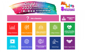 諮詢週日期: 2020年5月25至30日 形式:線上直播 https://www.cityu.edu.hk/jupas_consult/# 校園虛擬導賞:https://www.cityu.edu.hk/tour/ 聯招課程影片:https://www.admo.cityu.edu.hk/jupas/programmeList/